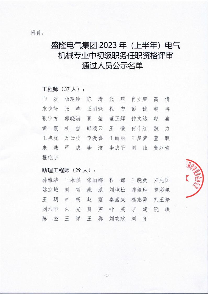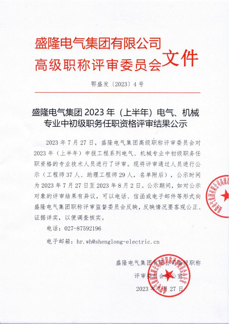 盛隆電氣集團2023年(上半年)電氣、機械專業中初級職務任職資格評審結果公示