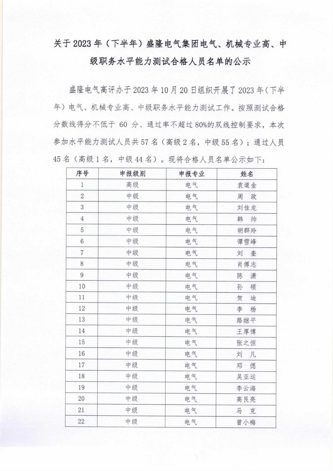關(guān)于2023年(下半年)盛隆電氣集團(tuán)電氣、機(jī)械專業(yè)高、中級(jí)職務(wù)水平能力測(cè)試合格人員名...